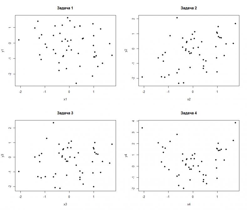 Мне показался он интересным и я его промоделировал Итак, есть четыре диаграммы рассеяния для двух переменных. Вопрос. В каких случаях линейная регрессия значима и p-value<0.05? http://aspirantura.spb.ru/forum/pict...pictureid=1099 P.S. Для экономии времени добавил открытый опрос. Исходный код, генерирующий эту картинку на R со всеми коэффициентами будет сразу по окончанию. |