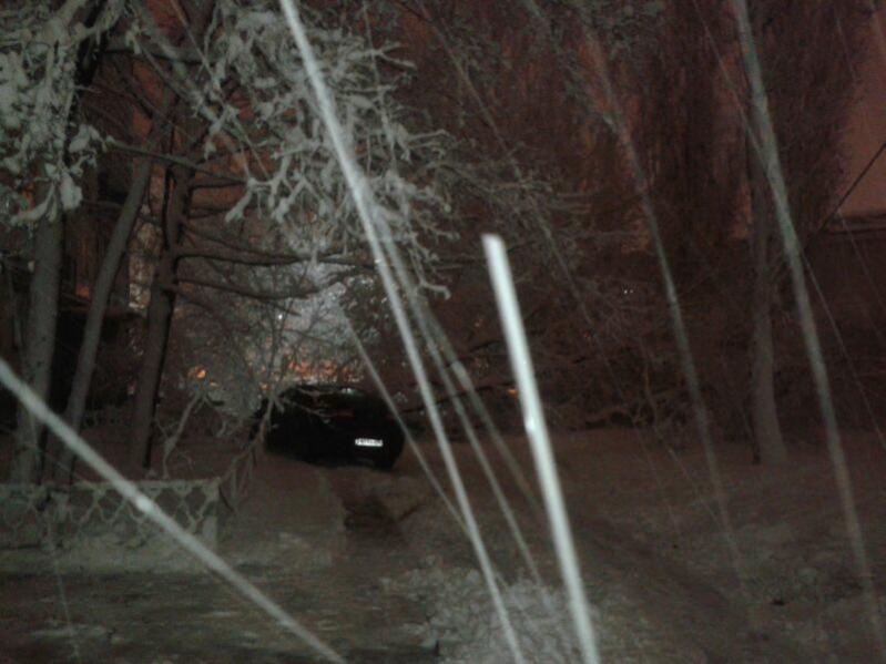 Последнее фото: дерево упало и перегородило дорогу. Белые линии - это снежинки...