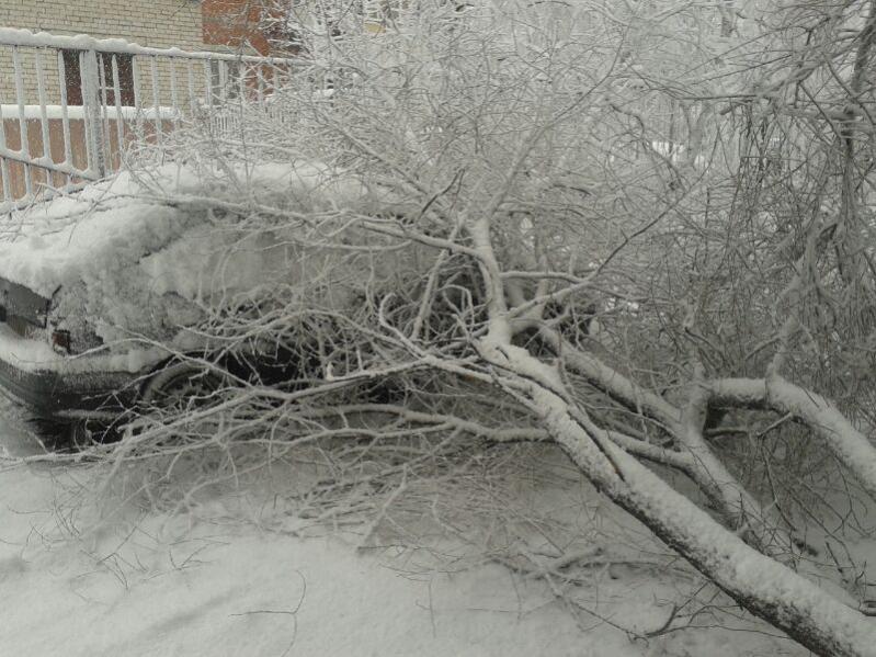 Жена счастлива, что с мелким не пошла гулять. Здоровенная ветка отломилась от дерева и упала на машину у подъезда. Снег все идет.